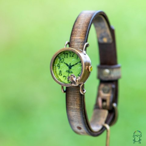 池をのぞく蛙腕時計Sライム|カエルの時計屋さん