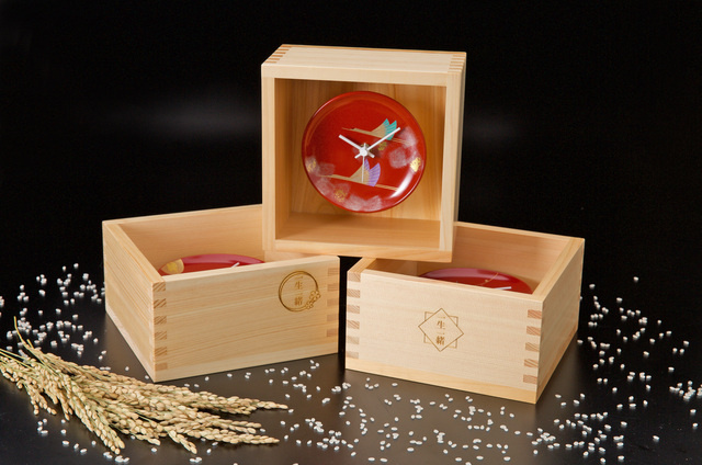 熟練した職人が手掛けた老舗の一升枡に、和式の結婚式で使う盃を思わせる朱赤皿、紅白を表現した白い時計針など、どれもお祝い事に相応しい魅力があります。