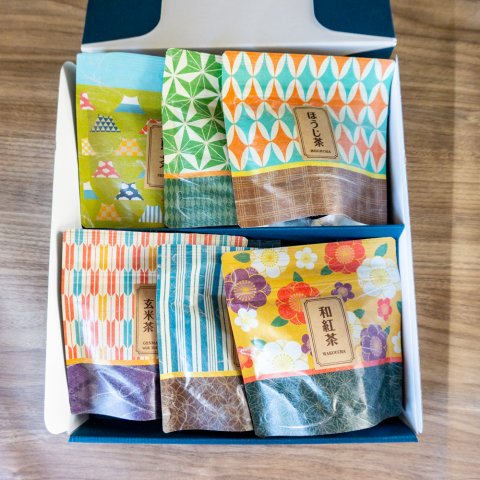 煎茶、ほうじ茶、和紅茶、抹茶入煎茶、抹茶入玄米茶、かりがね緑茶の6種類が詰められています。