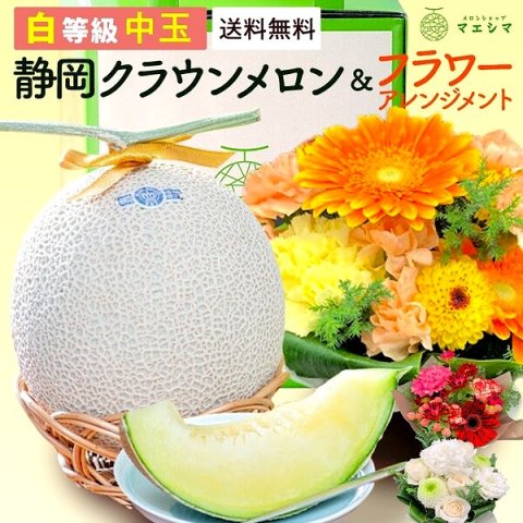 クラウンメロン+フラワーアレンジメントセット|メロンショップマエシマ有限会社