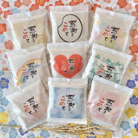 パッケージのデザインは、シンプルな米粒のイラストや赤いハート、クローバーなど9種類が展開されており、シーンや相手に合わせて好みのものを選べます。