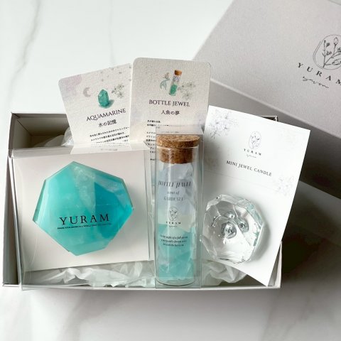 アクアマリンの美しい輝きを楽しめる宝石石鹸と、小粒の宝石を瓶に詰めたボトルジュエル、クリアで美しいミニジュエルキャンドルの3点が詰められています。